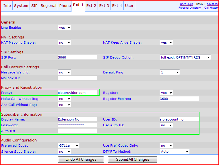 To test out your new SIP trunk you can put the values directly into the SPA941. The picture below shows the phones internal web config section, key fields have been highlighted.